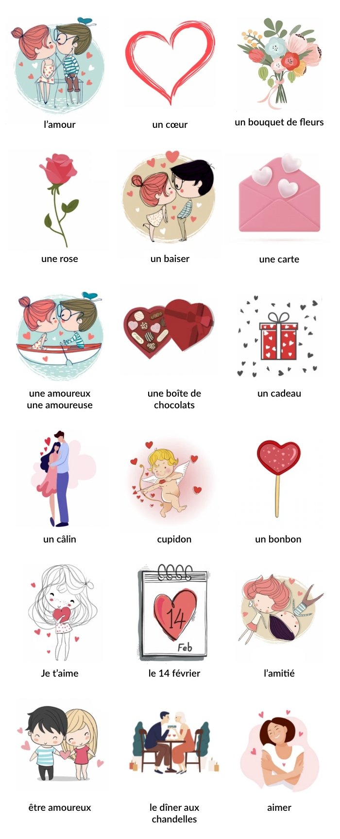 Embark on a linguistic journey into the heart of Valentine's Day with our curated vocabulary. From the timeless "l'amour" to the sweet embrace of "un câlin," each word paints a canvas of love. Join me in celebrating the language of affection and warmth.